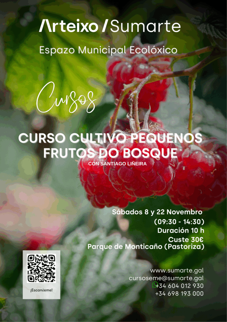 Este curso ten como obxectivo coñecer e aprender sobre o cultivo, coidado e colleita de froitas como arándoos, framboesas, mouras e amorodos. Este curso de dous sábados de duración cubre desde a planificación e plantación ata a recolección e coidados, ofrecendo coñecementos para cultivar estas bagas en casa ou a pequena escala.