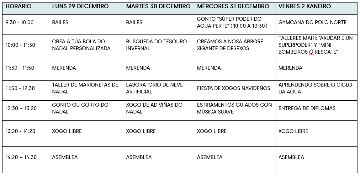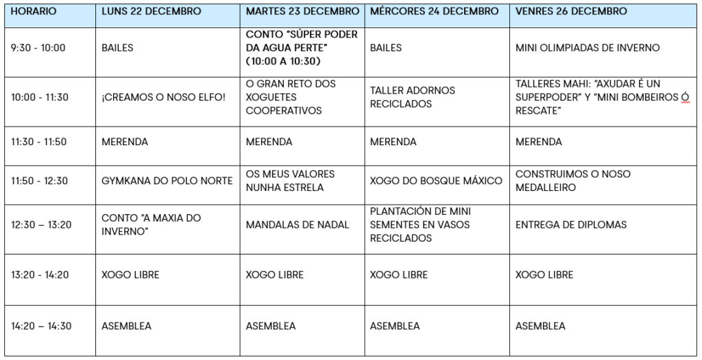 Datas: 1º semana: 22, 23, 24, 26 decembro e 2º semana: 29, 30, 31 decembro e 2 de enero